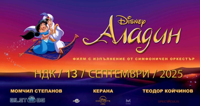 Пригответе се да изживеете магията на „Аладин“ на Дисни както никога досега! Оркестър „Симфониета София“ с гордост представя „Аладин“ на Дисни – концерт на живо с прожекция на филма, включващ легендарния, отличен с награди „Оскар“, „Златен глобус“ и „Грами“ саундтрак, изпълнен на живо. Под диригентската палка на уважавания маестро Свилен Симеонов, това зрелищно събитие ще се състои на 13 септември 2025 г. в престижната зала 1 на Националния дворец на културата (НДК) в София.