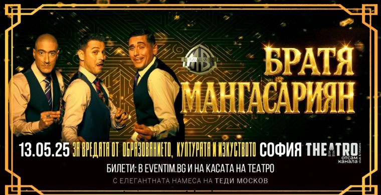 След поредица от нестандартни проекти, Братя Мангасариян отново ще заблестят на сцената с неподправения си стил и талант. Този път култовото трио ще представи комедийния мултимедиен шоу спектакъл „За вредата от образованието, културата и изкуството“, чиято премиера ще бъде на 13 май в Thѐatro отсам канала. Eдин спектакъл, пълен с ирония и интелектуални провокации към съвременните обществени ценности, който обещава да разтърси публиката от смях, размисли и парадокс.