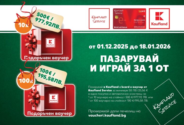 Kaufland България дава шанс на своите клиенти да спечелят ваучери за пазаруване до 500 евро или 977,92 лв., докато правят обичайните си седмични покупки в периода до 18 януари 2026 г. Достатъчно е в рамките на една покупка да бъде използван b-card електронен ваучер от Kaufland Service на стойност минимум 50 лв. или 25,56 евро. Така участието им в играта се активира автоматично, без каквато и да е регистрация, а всяка покупка, направена според условията, увеличава шанса им да бъдат сред печелившите на общо 110 награди, които ритейлърът ще раздаде.