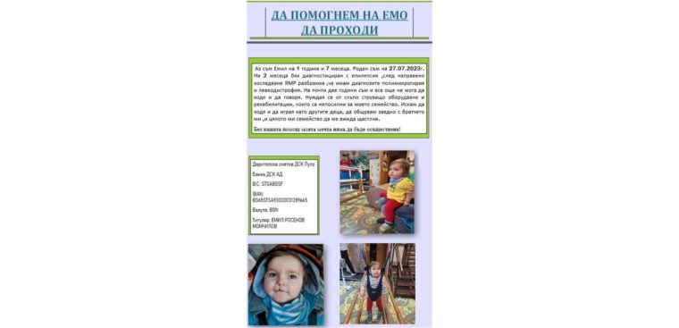 Всяко дете има право на детство. А Емо мечтае за най-обикновените неща – да прави първите си крачки, да каже първите си думи, да бъде просто дете. Но това зависи от средства, с които семейството му не разполага.