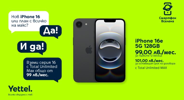 *Обявената цена е за устройство Apple iPhone 16e 5G 128GB и е валидна за първите 12 месеца при подписване на двугодишен договор с план Total Unlimited MAX с месечна такса от 75,99 лв. за първите 12 месеца. През втората година от договора месечната вноска е в размер на 101 лв. Повече информация на: https://www.yettel.bg/bg/iphone-16-seriya-s-nai-dobriya-ni-plan