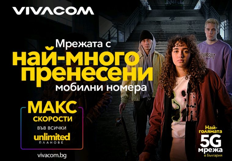 Операторът с най-много пренесени мобилни номера – Vivacom, удължава максималните скорости във всички Unlimited планове до края на февруари. Така всички нови и настоящи клиенти на мобилни планове от Vivacom получават неограничени възможности за невероятно изживяване на макс в най-голямата 5G мрежа в България, която покрива 91% от населението. Unlimited плановете на Vivacom са с най-голямата добавена стойност за клиентите до сега и са създадени, за да направят комуникацията и забавленията още по-достъпни.
