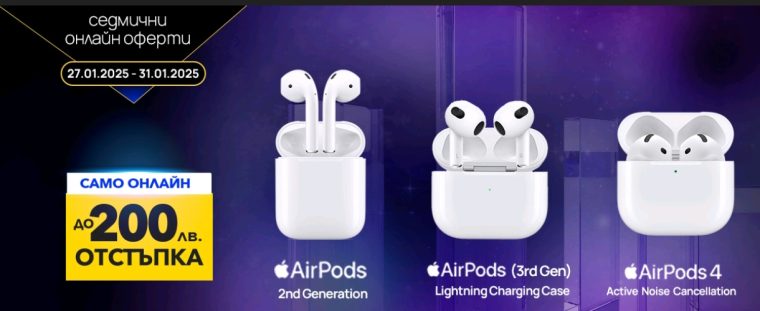 Vivacom предлага специална онлайн оферта с до 200 лева отстъпка на слушалки Apple AirPods. До края на месеца, всички любители на висококачествения звук и стилните технологии могат да избират от едни от най-популярните модели – AirPods 2nd Generation, AirPods 3rd Generation и AirPods 4.