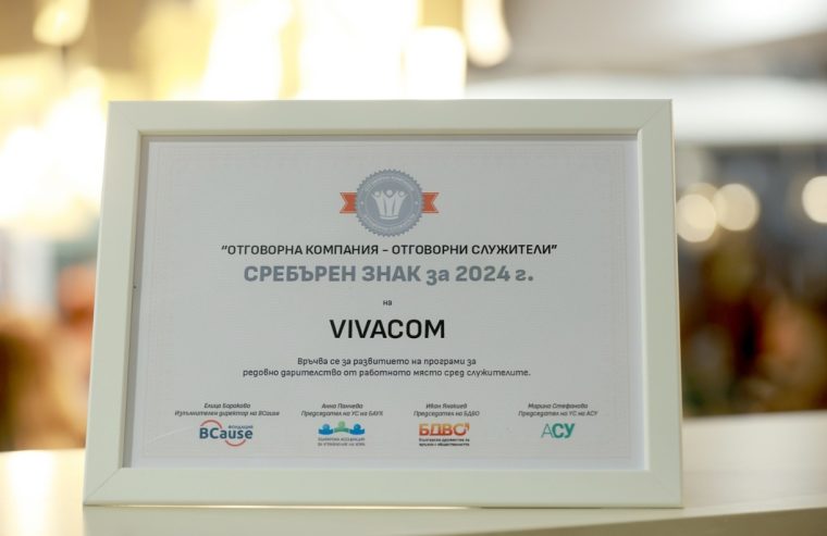 Vivacom получи ценното признание Сребърен знак „Отговорна компания – отговорни служители“ за 2024 година, присъдено от Фондация BCause съвместно с Българско дружество за връзки с обществеността и Българската асоциация за управление на хора. Наградата е оценка за усилията на компанията да насърчава ежемесечното дарителство и социалната отговорност сред служителите, като важен компонент на корпоративната култура. Благодарение на месечните дарения на служителите в програмата Viva Help са събрани общо 1 489 897.40 лева.